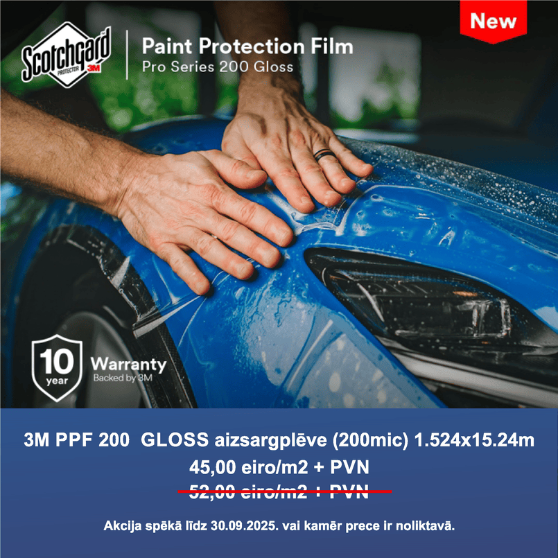 Aizsargājiet automobiļa krāsojumu un izvairieties no “apelsīna mizas” efekta uz pārklājumiem ar 3M™ Paint Protection Film Pro Series 200. Profesionālā aizsargplēve ir aprīkota ar optimizētu līmvielu ērtai plēves pārvietošanai, palīdzot samazināt pacēluma līniju un līmes pēdu veidošanos. Tā veido augsta spīduma apdari ar gludu virsmu, kurai piemīt hidrofobas īpašības ērtākai kopšanai. Pašatjaunojošā formula ļauj nelieliem skrāpējumiem izzust, kad plēves virsmai tiek pielikts karstums. Tā aizsargā transportlīdzekļa virsmas no akmentiņu triecieniem, skrāpējumiem, kukaiņu radītiem bojājumiem, ceļa darvas, traipiem, automobiļu šķidrumu pēdām un skarbiem ārējiem laikapstākļiem, tai skaitā intensīva ultravioleto (UV) staru iedarbība. Pieejama ar 10 gadu garantiju.